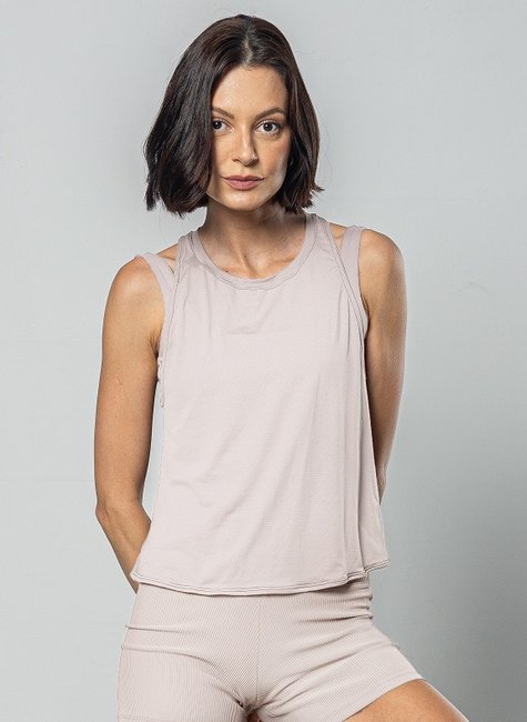 Para a Academia: combine a regata flex com peças mais ajustadas na parte de baixo, como a Legging Avelã Canelada, para um visual harmônico e moderno.